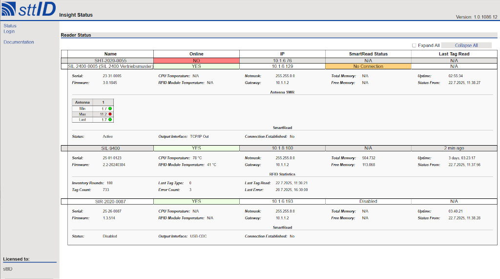 The sttID Software Insight collects status data from multiple sttID readers. It bundles this collected information and makes it available to all clients that connect to the monitoring service via HTTP. This allows users to easily view an overview of the status of the RFID readers in the network via a web browser without any additional software and to detect potential failures at an early stage.